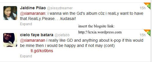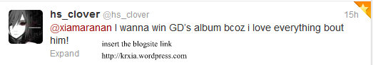 ex. ” I wanna win GD’s album bcoz… https://krxia.wordpress.com/2013/01/18/gd-giveaway-one-of-a-kind-album/ @xiamaranan “