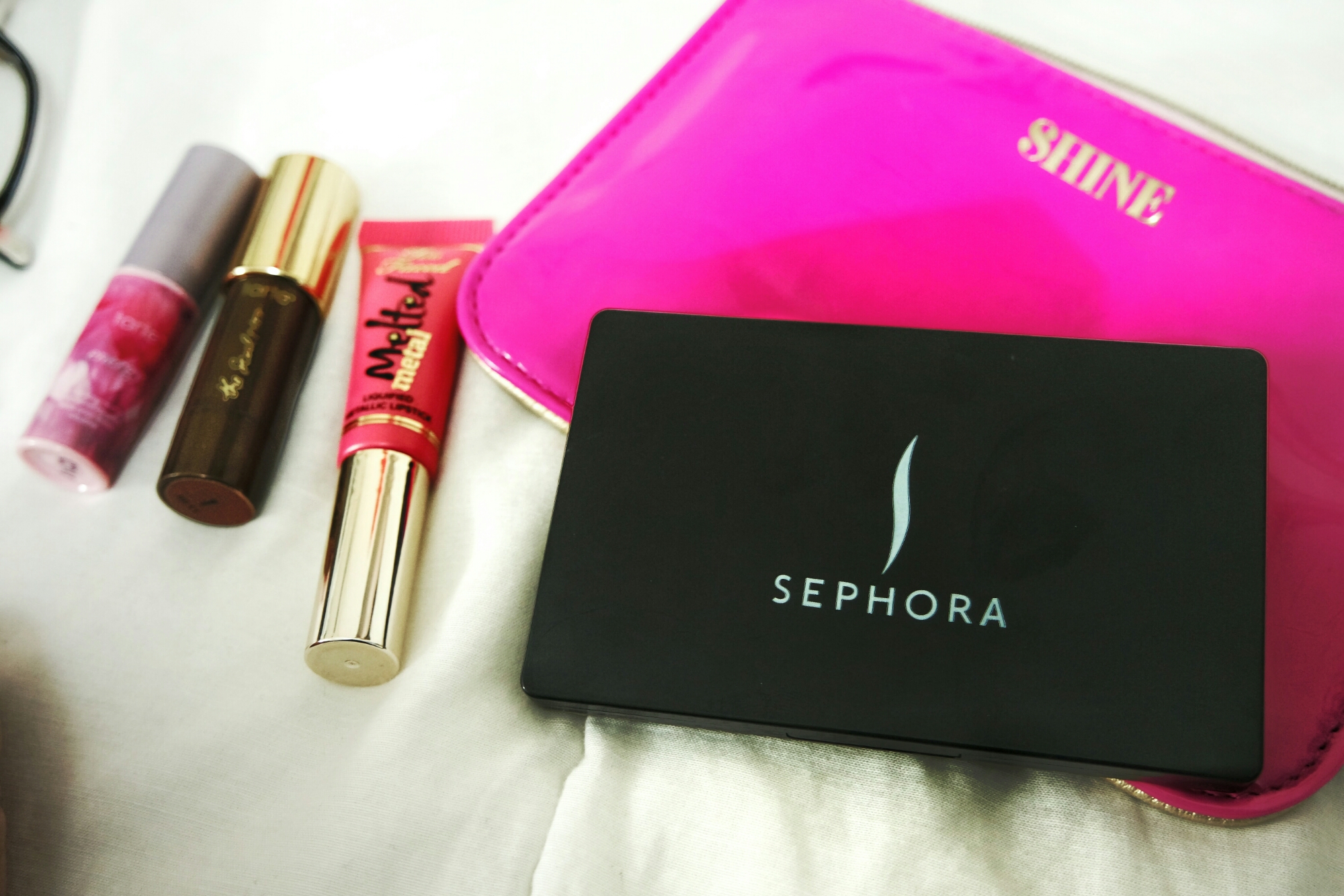 I have my Too Faced lip colour, that I randomly change depending on the color of my lips. I also have my Sephora mirror that I got last Christmas, which is a substitute for the pressed powder case mirror that I don’t have.